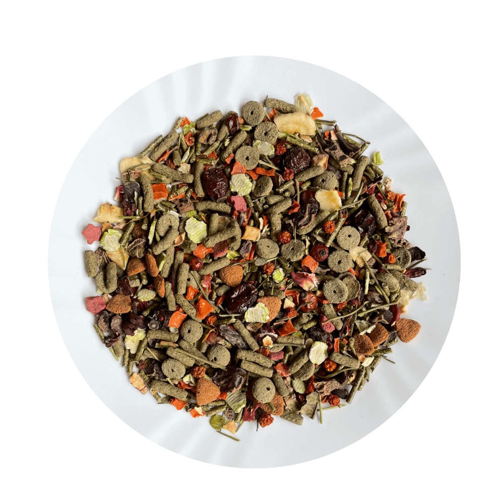 Složení: Vojtěška, ovoce (šípky, jeřabiny, jablka, rozinky, banán), hrachové vločky, extrudovaná kukuřičná mouka, extrudovaná pšeničná mouka, svatojánský chléb, zelenina (mrkev, petržel), extrudovaná hrachová mouka, jablečná vláknina, bylinky.