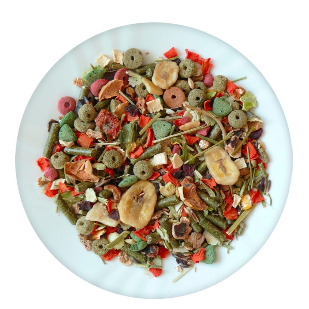 Složení: Vojtěška, zelenina (mrkev, červená řepa, pastinák, petržel), extrudovaná kukuřičná mouka, extrudovaná pšeničná mouka, seno, hrachové vločky, svatojánský chléb, ovoce (jablka, banány), extrudovaná hrachová mouka, jablečná vláknina.