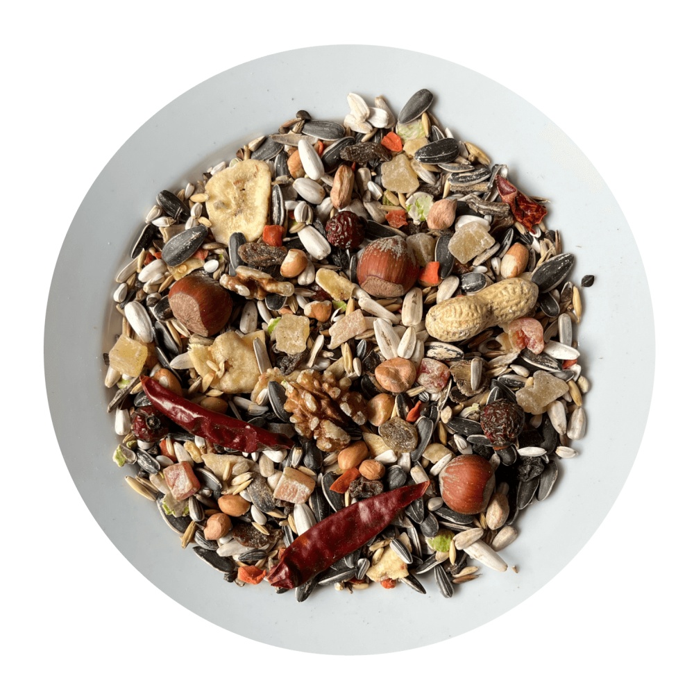 Složení: Ovoce (banány, papája, ananas, rozinky, šípky), ořechy (lískové, vlašské, buráky), slunečnice žíhaná velká, slunečnice bílá, světlice barvířská, oves nahý, pohanka, hrachové vločky, oves (žlutý, černý), extrudované granule s ovocem, paddy rýže, svatojánský chléb, sušená mrkev, chilli papričky.