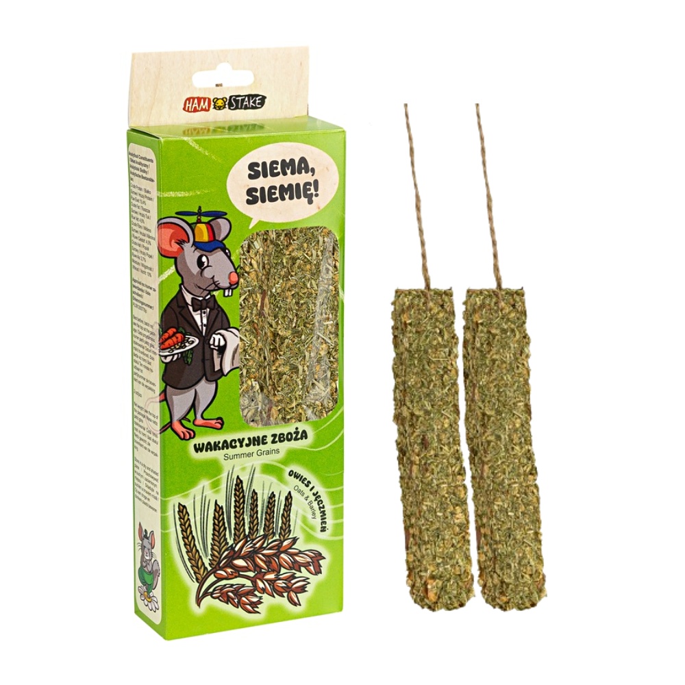 Ham Stake přírodní pamlsek pro hlodavce ve tvaru tyčinky na provázku s příchutí letního obilí.