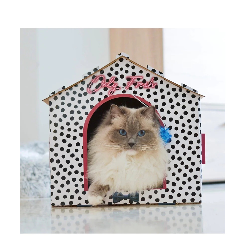 Kartonový domeček pro kočky Amanova. Uvnitř na podlaze škráblo a zavěšená chlupatá bambulka pro hodiny zábavy vaší kočky. Rozměry: 38 x 39 x 37 cm