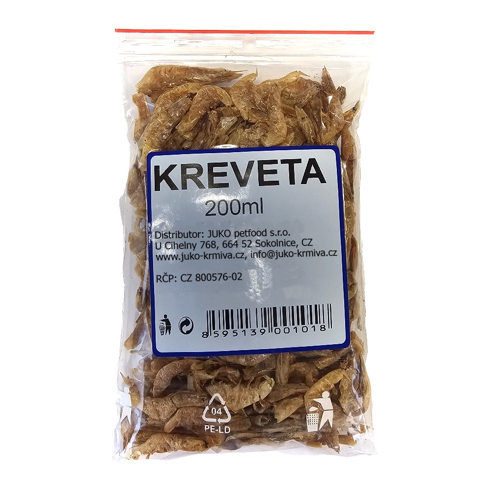 Použití a dávkování: krevety mohou být podávány jako samostatné krmivo, doplněk hlavní stravy nebo pamlsek. Přizpůsobte množství velikosti a potřebám zvířete. U ryb je možné je přimíchat do krmných směsí nebo podávat přímo na hladinu vody.