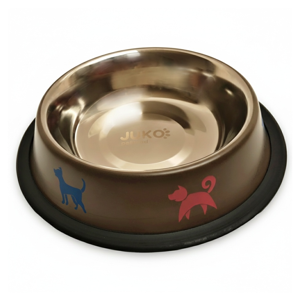 Hnědá nerezová miska s barevnými pejsky po obvodu. Miska je opatřena gumovým kroužkem, aby byla stabilní a neklouzala po podlaze.