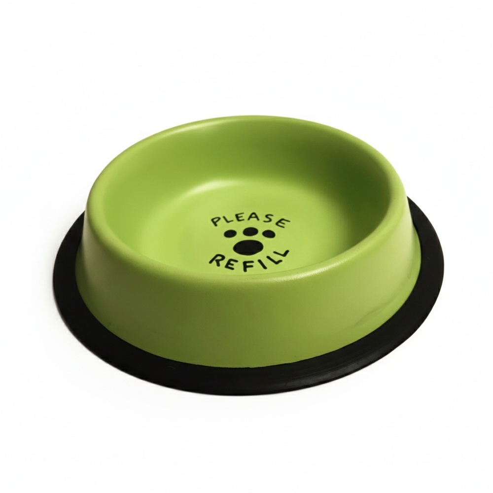 Pastelově zelená nerezová miska s nápisem na dně. Miska je opatřena gumovým kroužkem, aby byla stabilní a neklouzala po podlaze.
