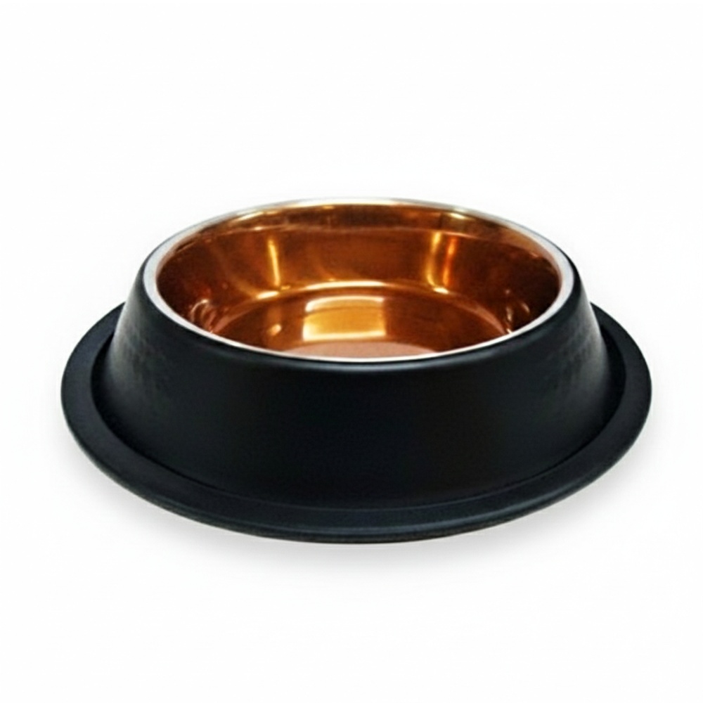 Nerezová miska ve velmi netradičním vzhledu. Kombinace černé barvy na vnější straně a měděné uvnitř je netradiční a zajímavá. Spodní okraj je opatřen gumou, aby miska neklouzala po podlaze.