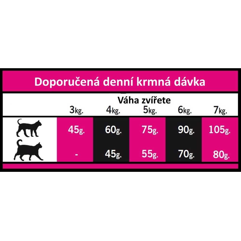 Snadno stravitelné sacharidy, pro zajištění kvalitní srsti, kůže a podporu trávení. Obsah omega 3 a 6 esenciálních mastných kyselin pro správné fungování mozku a optimální kondici kardiovaskulárního systému. Obsah zinku napomáhá udržovat zdravou kůži a lesklou srst. FOS + MOS s prebiotickými účinky přispívá ke zdraví trávícího traktu. Vysoká kvalita různých druhů masa, olejů a extraktů dělá krmivo velmi chutné i pro vybíravé kočky.