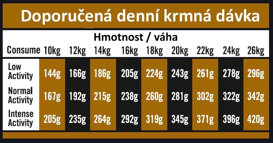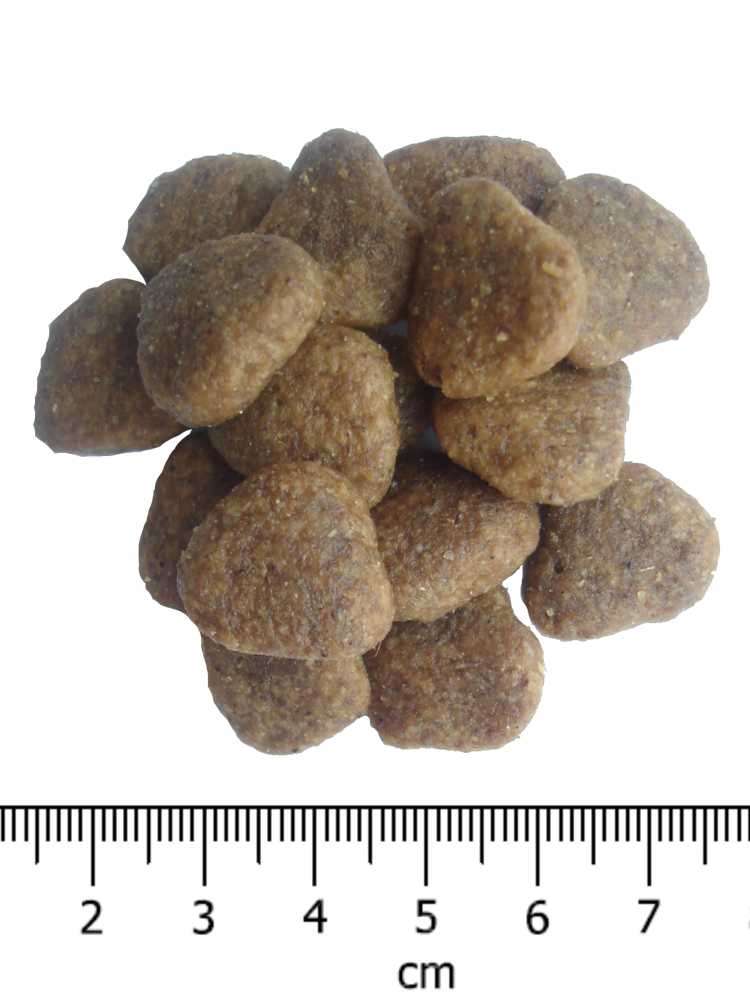 Analytické složky: Hrubý protein 26 %, hrubý olej a tuky 16 %, EPA+DHA 500 mg / kg, hrubá vláknina 2,75 %, hrubý popel 8 %, vápník 1,35 %, fosfor 0,95 %.
