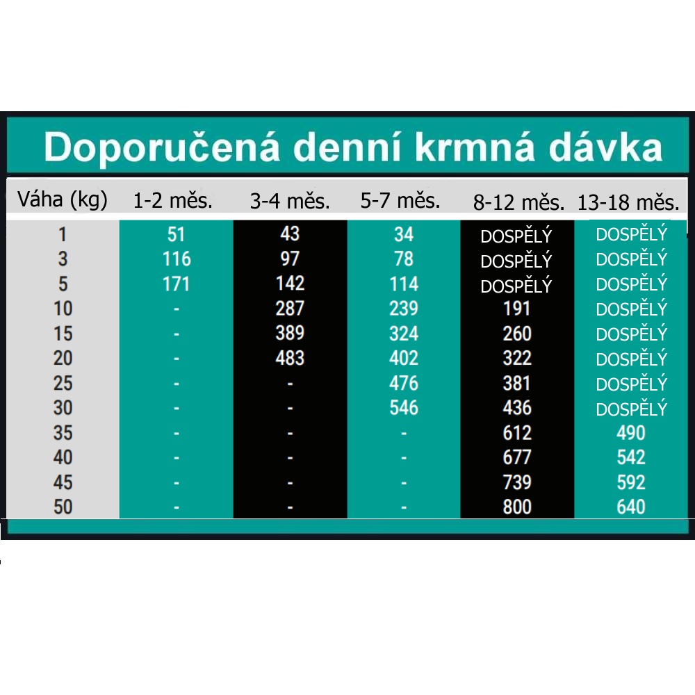 Analytické složky: Hrubý protein 30 %, hrubé oleje a tuky 22 %, omega-3 mastné kyseliny 0,80 %, omega-6 mastné kyseliny 2,00 %, EPA + DHA 500 mg/kg, hrubá vláknina 2,75 %, hrubý popel 8 %, vápník 1,50 %, fosfor 1,15 %. Metabolizovatelná energie: 4 112 kcal/kg.