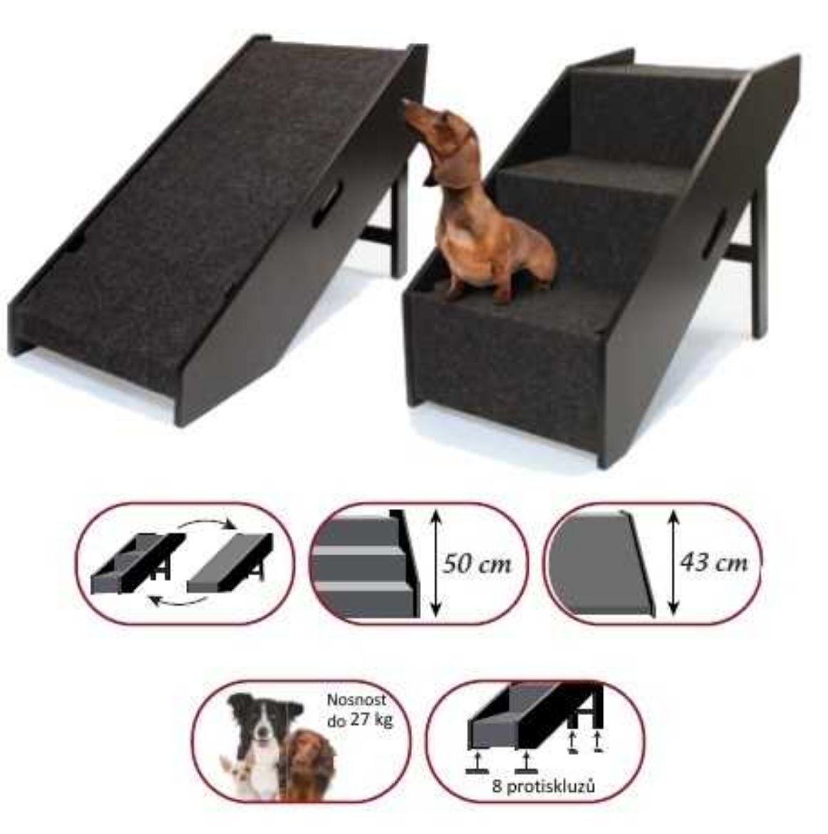 Vhodný pro psy do maximální hmotnosti 27 kg a je pokrytý kobercem, aby váš mazlíček během používání neuklouzl.