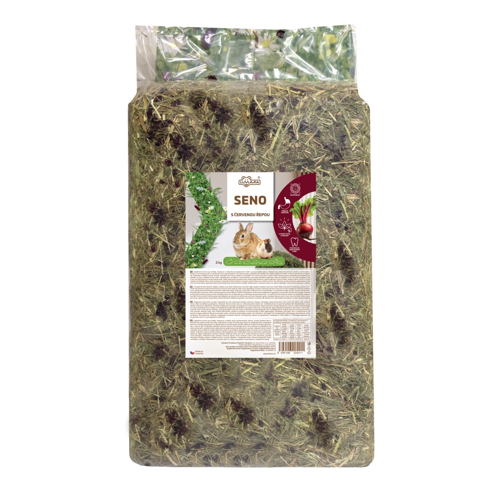 Kvalitní doplňkové krmivo pro králíky, morčata, činčily, křečky a další býložravé hlodavce, vyrobené ze sena z českých luk. Seno je obohaceno o o červenou řepu, která přirozeně zvyšuje chutnost sena a zpestřuje krmnou dávku.