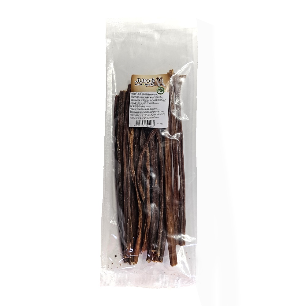100 % přírodní sušená pochoutka. Pružná a houževnatá, jemně aromatická vepřová tenká střívka s chutnou dužinou lze podávat celá nebo je krájením upravovat na jednotlivé odměňovací pamlsky pro kočky, malé či větší pejsky. Napomáhají čistit chrup, posilují žvýkací svaly a příznivě působí na střevní flóru. Průměrná tloušťka 5 - 9 mm, délka střívek 20 cm. Pamlsek přírodního původu, bez chemických a konzervačních látek.. ILUSTRATIVNÍ FOTO